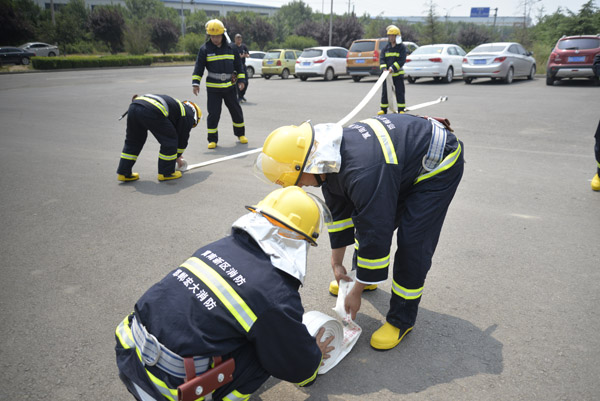 公司大門外進(jìn)行消防水帶與消防栓的對(duì)接演習(xí),此時(shí)正是上午11點(diǎn),驕陽(yáng)似火、酷熱難耐,室外的溫度足有37、8度,再加上消防員們穿著厚重的消防服,隊(duì)員們個(gè)個(gè)大汗淋漓、汗流浹背,但隊(duì)員們?cè)谟?xùn)練中每一個(gè)動(dòng)作都一絲不茍、規(guī)范操作,體現(xiàn)了消防員們過硬的素質(zhì)!