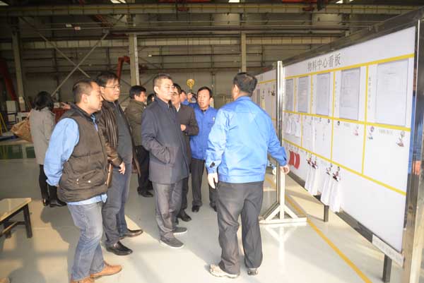 邯鄲宏大公司總經(jīng)理杜榮念、黨委書記邱進才、黨委副書記、紀委書記、工會主席況聯(lián)勇、副總經(jīng)理王長武陪同葉茂新一行視察了公司產(chǎn)品展廳。杜榮念對邯鄲宏大的發(fā)展歷程和未來發(fā)展規(guī)劃做了介紹,并結(jié)合產(chǎn)品模型和照片對企業(yè)的產(chǎn)品研發(fā)和銷售情況做了簡介。之后,葉茂新一行視察了生產(chǎn)工作現(xiàn)場和生產(chǎn)處工作大廳。在生產(chǎn)現(xiàn)場,主管生產(chǎn)的副總經(jīng)理王長武就邯鄲宏大目前的生產(chǎn)形勢和企業(yè)的精益管理工作所取得的成績向葉茂新一行作了匯報。邯鄲宏大目前生產(chǎn)任務飽滿,職工們情緒高漲,正在大干四季度,為完成全年的工作目標而努力,葉茂新對現(xiàn)場干凈整潔的環(huán)境,擺放有序的機件表示滿意。在視察機加工現(xiàn)場時,王長武結(jié)合現(xiàn)場的一個機件,詳細介紹了從原來的十幾道工序,經(jīng)過技術(shù)改進和工裝的改進,現(xiàn)在只需要一次夾裝就可以加工完成,極大的提高了工作效率。在鉚焊分廠工作現(xiàn)場,王長武結(jié)合企業(yè)精益管理中實行的“配餐制”,職工們當天需要加工的產(chǎn)品機件和圖紙、工裝、工具,一律由“配送中心”用配送車方式集中配送到每個人面前,職工們拿起圖紙和工具就能干活,大大減少了職工的準備工作時間,提高了工作效率,職工們的收入也得到了相應的提高。葉茂新對邯鄲宏大目前的經(jīng)營生產(chǎn)形勢非常滿意,對企業(yè)搬入新廠區(qū)后翻天覆地的變化表示贊賞,并提出了很多指導性意見。