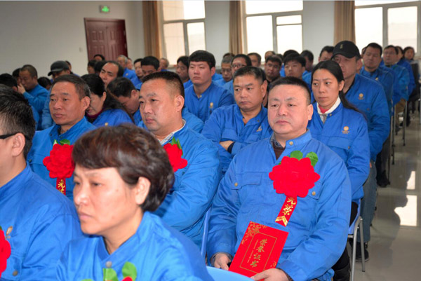 受到表彰的公司勞模、先進(jìn)個(gè)人、先進(jìn)集體代表披紅戴花在會(huì)場(chǎng)前排就座。