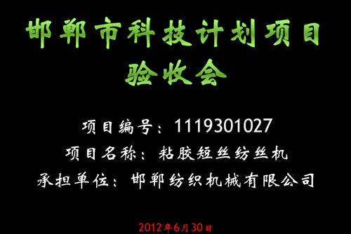 2012年6月30日,由邯鄲市科技局組織并主持,邀請(qǐng)有關(guān)專家組成驗(yàn)收委員會(huì),對(duì)邯鄲紡織機(jī)械有限公司承擔(dān)的2011年度邯鄲市科技重點(diǎn)項(xiàng)目“粘膠短絲紡絲機(jī)”(項(xiàng)目編號(hào):1119301027)進(jìn)行了驗(yàn)收。專家組認(rèn)真聽(tīng)取了項(xiàng)目承擔(dān)單位的工作報(bào)告、技術(shù)報(bào)告和專項(xiàng)資金審計(jì)報(bào)告,進(jìn)行了實(shí)地考察,經(jīng)討論形成如下意見(jiàn):